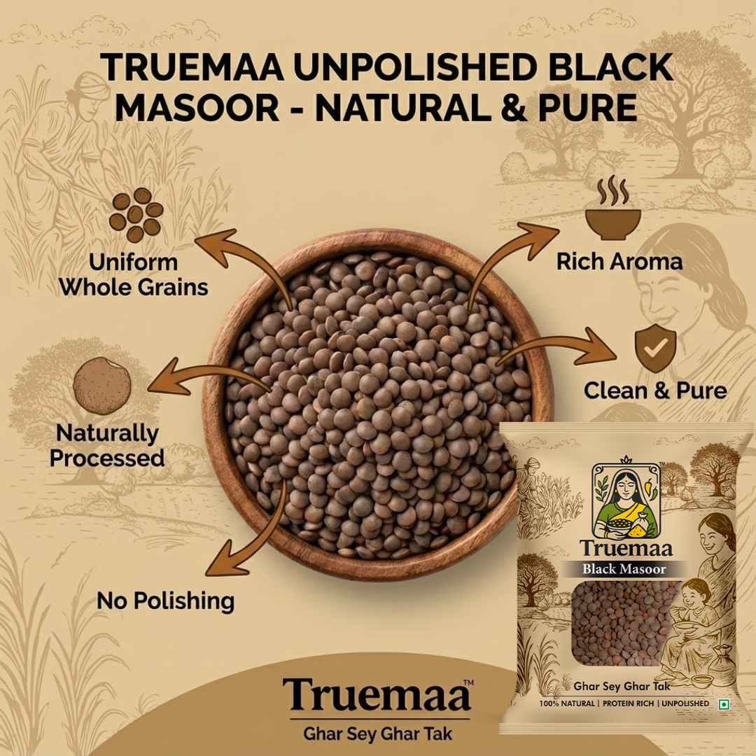 Truemaa Black Masoor Dal (1kg) is completely unpolished and naturally processed to retain its original goodness. Carefully cleaned and free from artificial treatments, it brings pure nutrition straight from the farm to your kitchen.