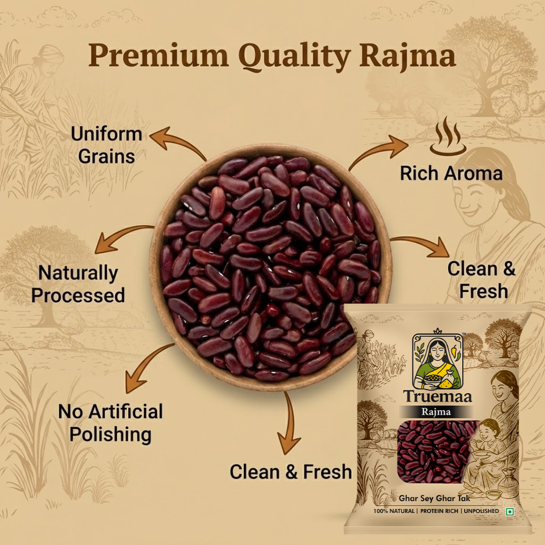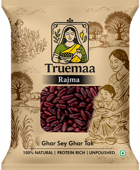 Truemaa unpolished Rajma (1kg) is thoughtfully sourced from quality farms and processed to deliver consistent taste and dependable cooking results. These whole kidney beans are naturally cleaned and packed with care to maintain their original colour, firmness, and natural goodness.